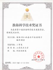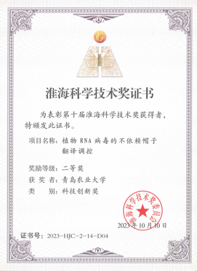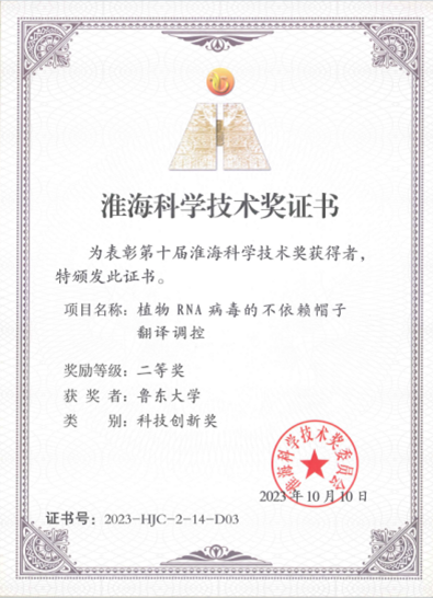 12月15日,淮海科學(xué)技術(shù)獎(jiǎng)委員會(huì)舉行第十屆淮海科學(xué)技術(shù)獎(jiǎng)表彰頒獎(jiǎng),山東植物病理學(xué)會(huì)秘書(shū)長(zhǎng)原雪峰教授主持成果《植物RNA病毒的不依賴帽子翻譯調(diào)控》獲得第十屆淮海科學(xué)技術(shù)獎(jiǎng)二等獎(jiǎng)(科技創(chuàng)新獎(jiǎng)),作為獲獎(jiǎng)代表上臺(tái)領(lǐng)獎(jiǎng)。學(xué)會(huì)會(huì)員山東農(nóng)業(yè)大學(xué)于成明、劉志菲,棗莊學(xué)院王德亞,魯東大學(xué)耿國(guó)偉,青島農(nóng)業(yè)大學(xué)曹欣然,中國(guó)農(nóng)業(yè)科學(xué)院煙草研究所劉珊珊等單位人員作為團(tuán)隊(duì)成員獲獎(jiǎng)。